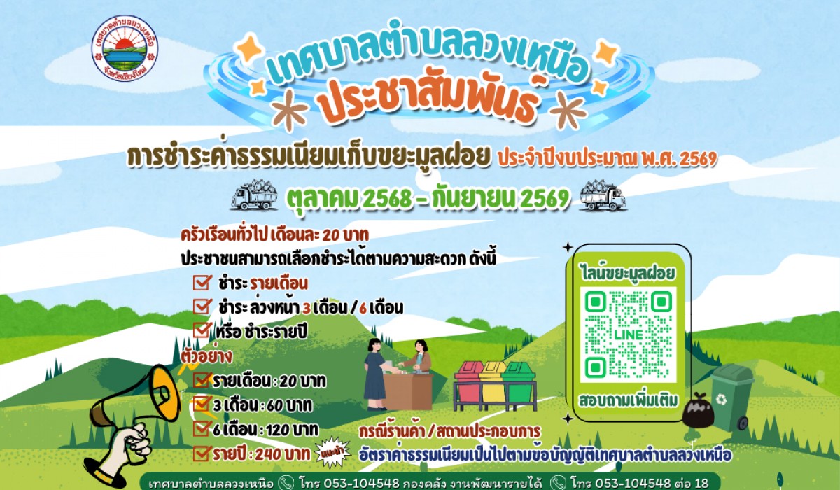 - ประกาศประกวดราคาจ้างเหมาบริการจัดเก็บขยะมูลฝอยและนำไปกำจัดภายในเขตเทศบาลตำบลลวงเหนือ ประจำปีงบประมาณ 2568 ห้วงระยะเวลาตั้งแต่วันที่ 1 ตุลาคม 2567 ถึงวันที่ 31 ธันวาคม 2567 ด้วยวิธีประกวดราคาอิเล็กทรอนิกส์ (e-bidding)(20 ก.ย. 67)