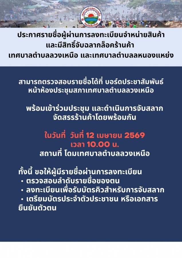 เทศบาลตำบลลวงเหนือ ขอแจ้งประกาศรายชื่อผู้ผ่านการลงทะเบียนจำหน่ายสินค้าและมีสิทธิ์จับฉลากล็อคร้านค้า ทั้งในเขตเทศบาลตำบลลวงเหนือ และเทศบาลตำบลหนองแหย่ง เข้าตรวจสอบรายชื่อผู้ผ่านการลงทะเบียน พร้อมเข้าร่วมประชุม และดำเนินการจับสลากจัดสรรร้านค้าโดยพร้อมเพรียงกัน