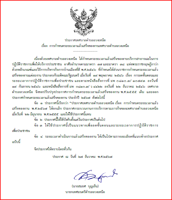 เนื่องด้วยเทศบาลตำบลลวงเหนือ ได้กำหนดระยะเวลาแล้วเสร็จของงานบริการสาธารณะในการปฏิบัติราชการเพื่อให้บริการประชาชน