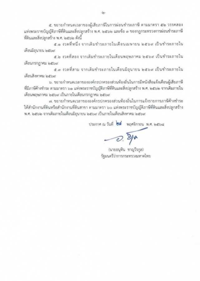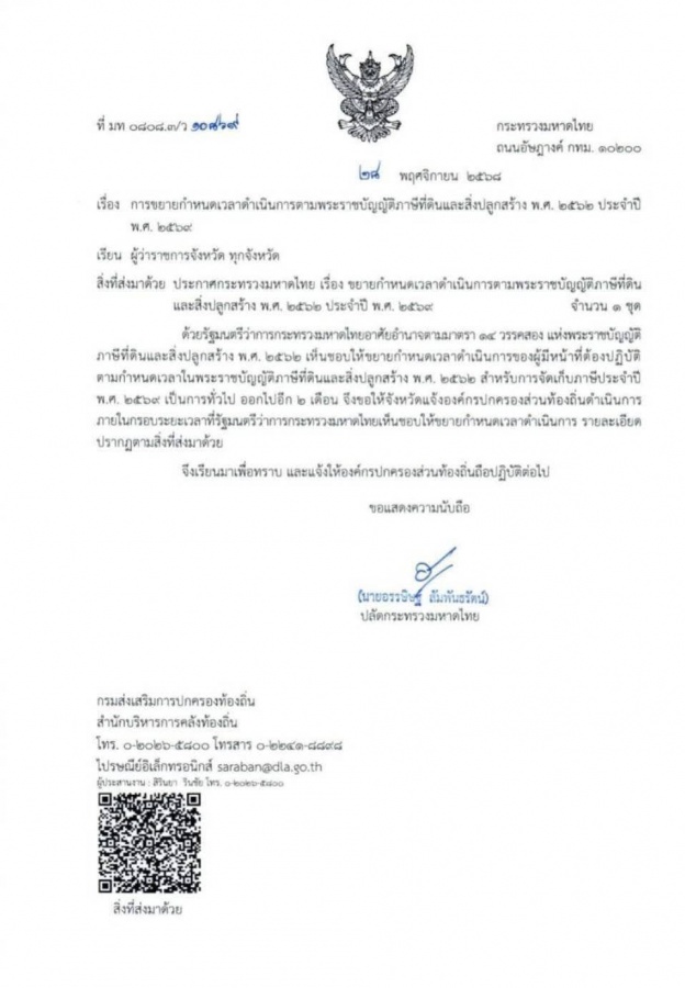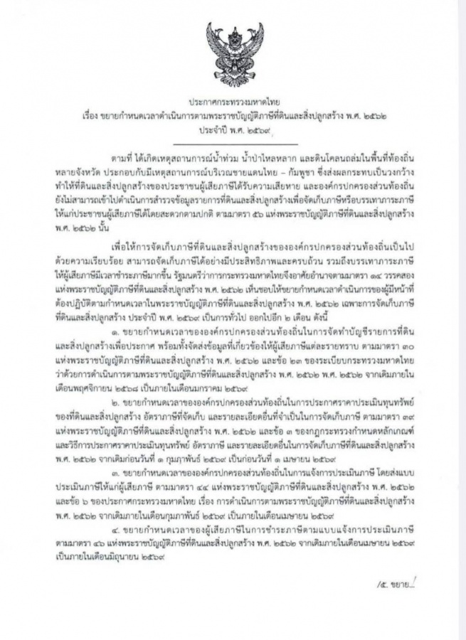 ขยายกำหนดเวลาดำเนินการตามพระราชบัญญัติภาษีที่ดินและสิ่งปลูกสร้าง พ.ศ. 2562 ประจำปี พ.ศ. 2569