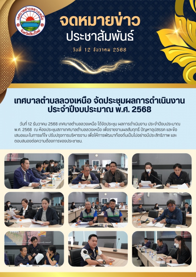 วันที่ 12 ธันวาคม 2568 เทศบาลตำบลลวงเหนือ ได้จัดประชุม ผลการดำเนินงาน ประจำปีงบประมาณ พ.ศ. 2568 นำโดย นายกเทศมนตรี คณะผู้บริหาร สมาชิกสภา กำนัน/ผู้ใหญ่บ้าน และข้าราชการที่เกี่ยวข้อง ณ ห้องประชุมสภาเทศบาลตำบลลวงเหนือ เพื่อรายงานผลสัมฤทธิ์ ปัญหาอุปสรรค และข้อเสนอแนะในการแก้ไข ปรับปรุงการบริหารงาน เพื่อให้การพัฒนาท้องถิ่นเป็นไปอย่างมีประสิทธิภาพ และตอบสนองต่อความต้องการของประชาชน