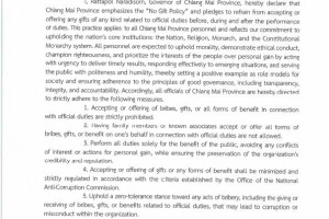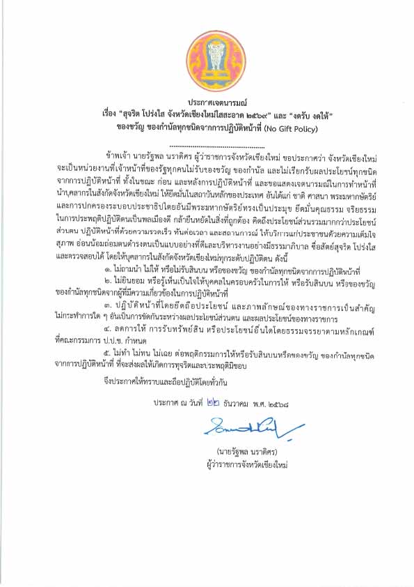 ประกาศเจตนารมณ์ เรื่อง “สุจริต โปร่งใส จังหวัดเชียงใหม่ใสสะอาด ๒๕๖๙" และ "งดรับ งดให้" ของขวัญ ของกำนัลทุกชนิดจากการปฏิบัติหน้าที่ (No Gift Policy)