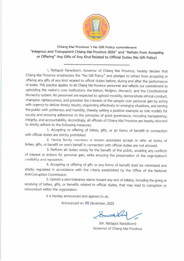 เรื่อง “สุจริต โปร่งใส จังหวัดเชียงใหม่ใสสะอาด ๒๕๖๙" และ "งดรับ งดให้" ของขวัญ ของกำนัลทุกชนิดจากการปฏิบัติหน้าที่ (No Gift Policy)