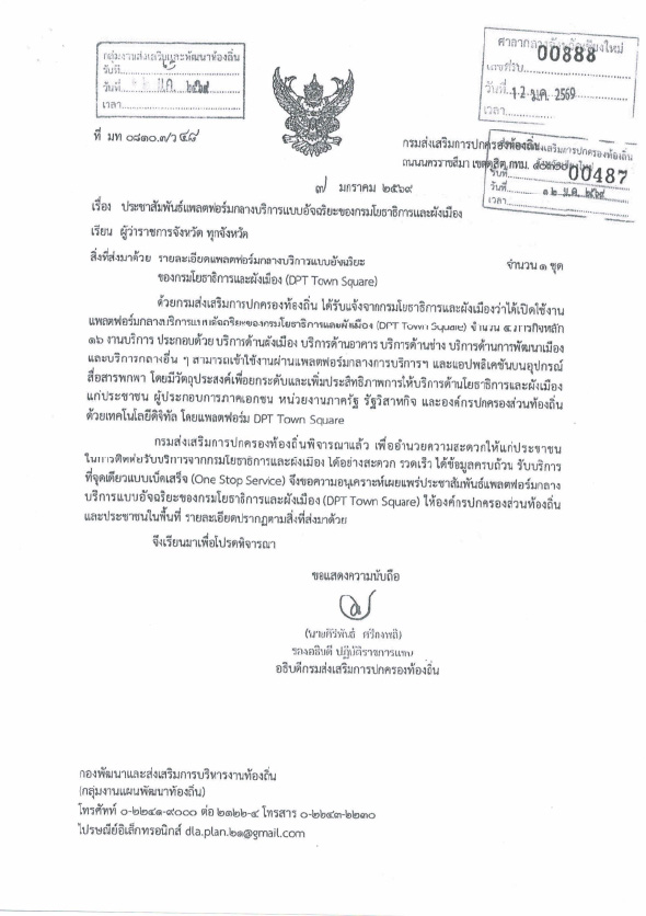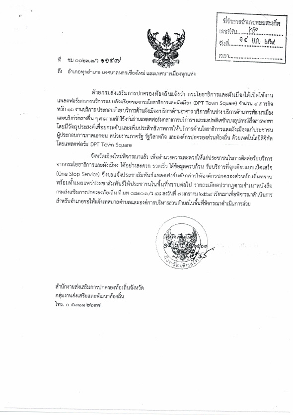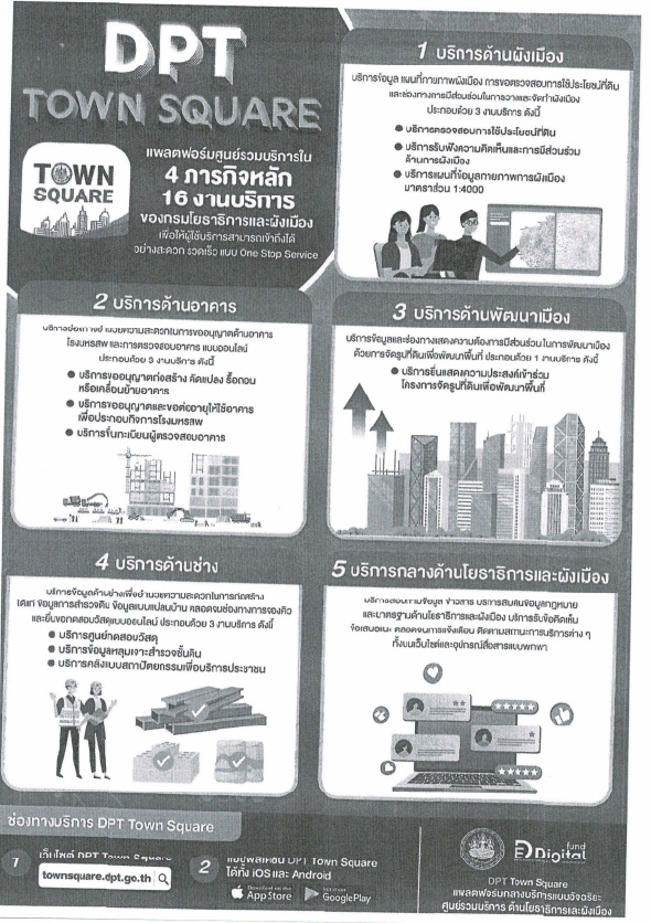 ประชาสัมพันธ์เทศบาลตำบลลวงเหนือ กรมโยธาธิการและผังเมืองได้เปิดใช้งานแพลตฟอร์มกลางบริการแบบอัจฉริยะของกรมโยธาธิการและผังเมือง (DPT Town Square)