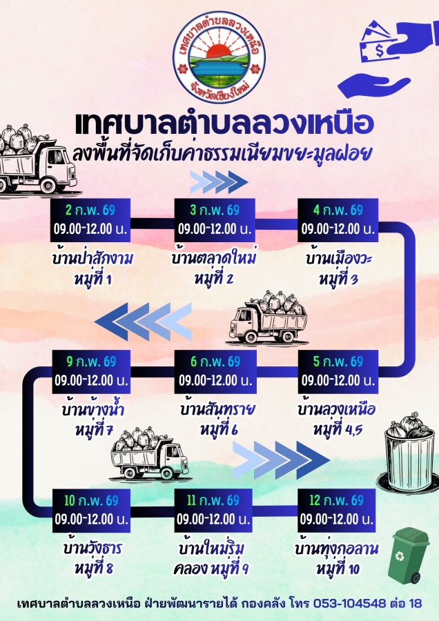 เทศบาลตำบลลวงเหนือ ขอแจ้งการเปลี่ยนแปลงรูปแบบการรับชำระค่าธรรมเนียมเก็บและขนมูลฝอย เพื่ออำนวยความสะดวกให้กับพี่น้องประชาชนในพื้นที่