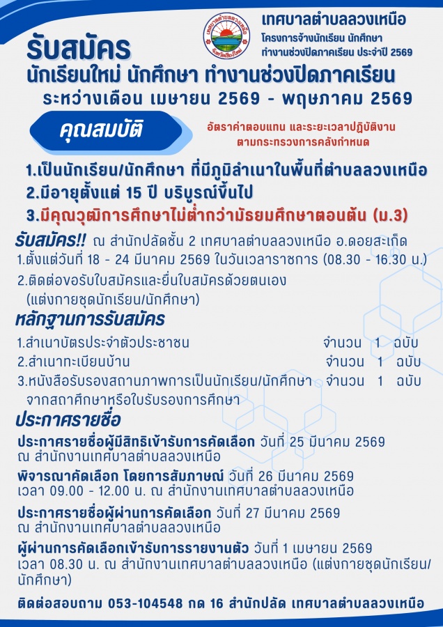 วันที่ 1 เมษายน 2569 เวลา 08.30 น. ณ สำนักงานเทศบาลตำบลลวงเหนือ (แต่งกายชุดนักเรียน/นักศึกษา)